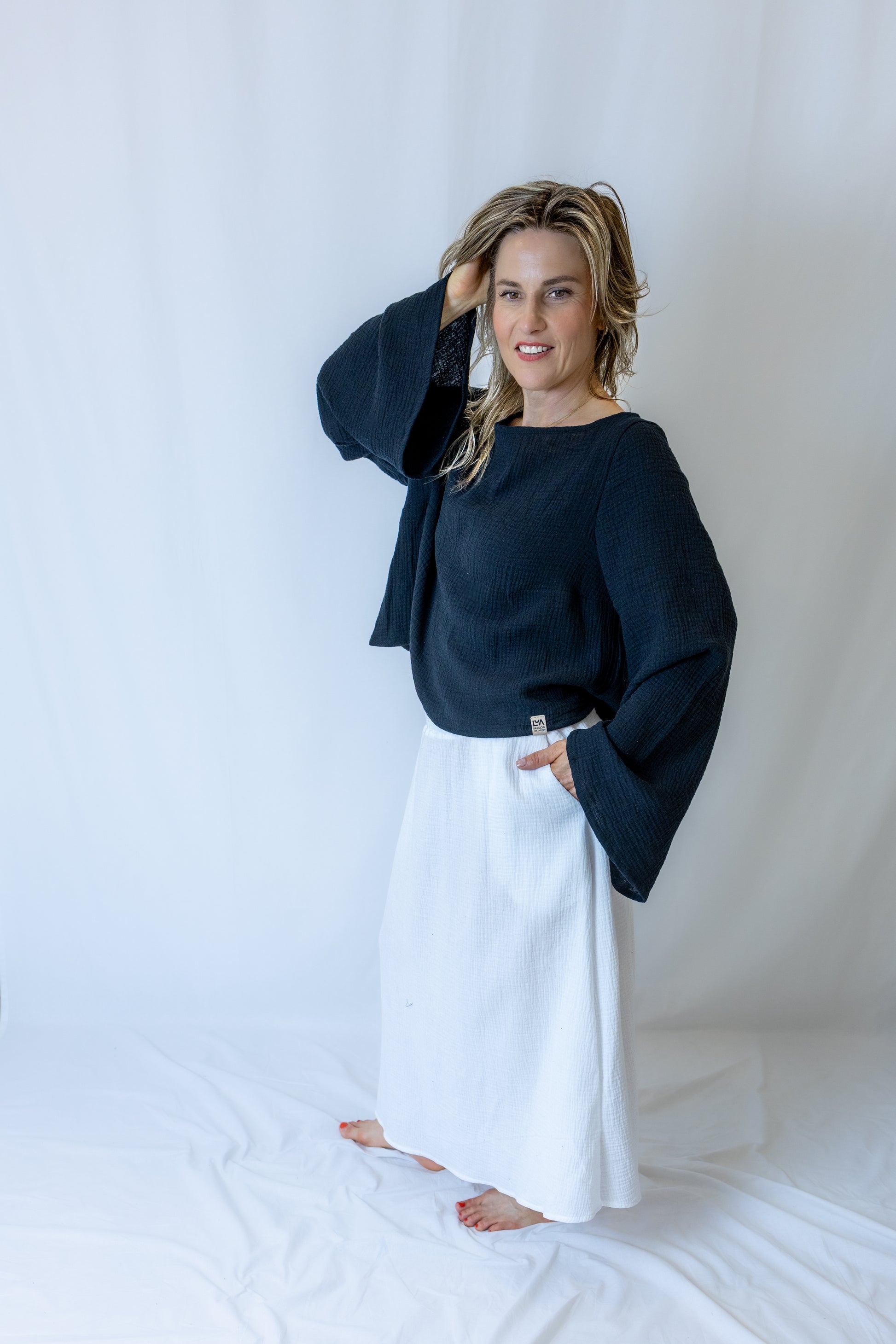Lehkost, elegance a volnost – to je náš top Amapola z jemného bavlněného mušelínu. Díky vzdušným širokým rukávům a uvolněnému střihu je ideální pro teplé dny, kdy chcete vypadat stylově a zároveň se cítit pohodlně.